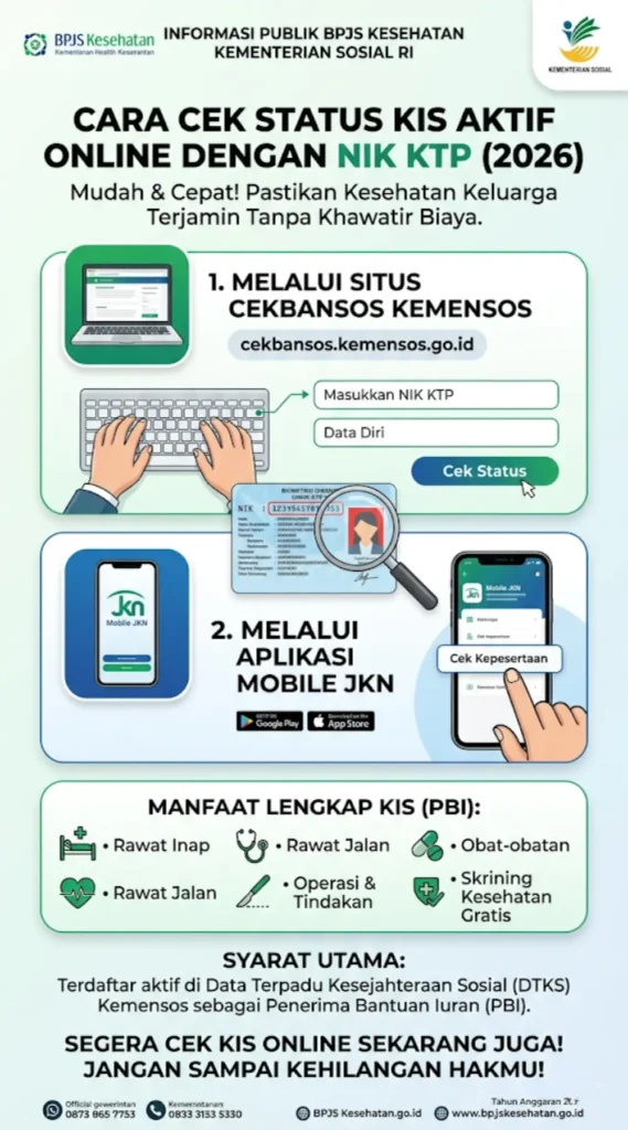 Cara Cek KIS Online Dengan NIK kini semakin mudah di tahun 2026. Cukup buka situs cekbansos.kemensos.go.id atau aplikasi Mobile JKN, masukkan NIK kamu, dan langsung tahu status Kartu Indonesia Sehat.