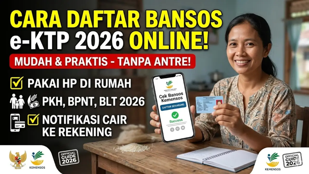 Cara daftar Bansos e-KTP Online 2026 paling mudah lewat cekbansos.kemensos.go.id. Cukup pakai HP dan e-KTP, kamu bisa daftar sendiri tanpa antre di kelurahan. Panduan lengkap ini jelaskan langkah demi langkah daftar Bansos PKH, BPNT, dan program lain tahun 2026, syarat wajib, cara cek status, hingga mengatasi penolakan data ganda.