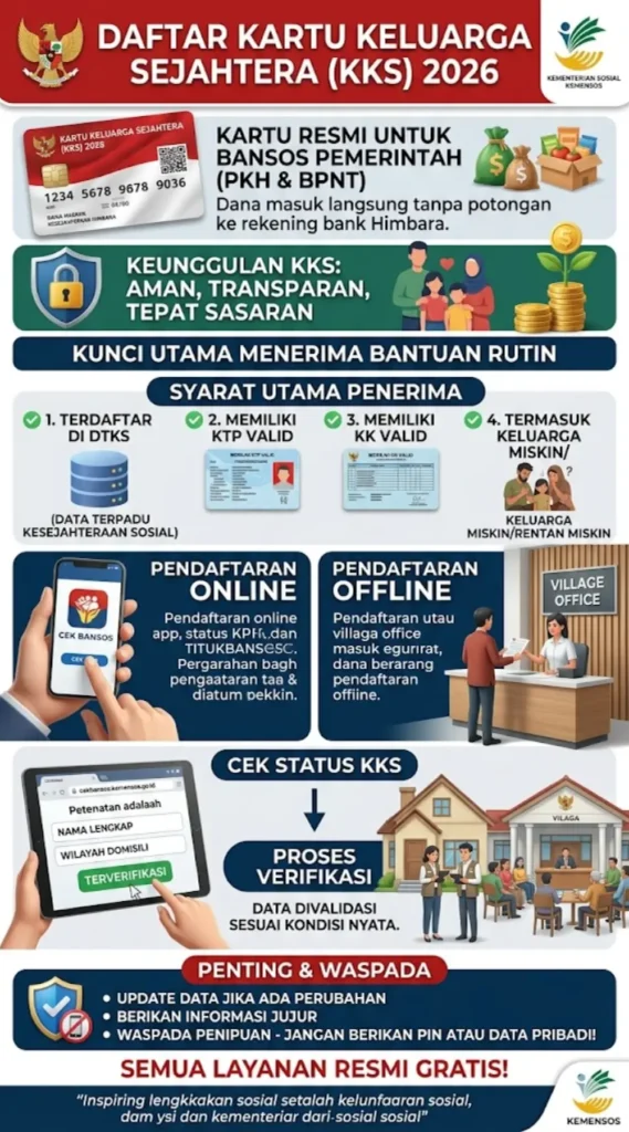 Ingin mendapatkan berbagai bansos pemerintah tahun 2026? Artikel ini membahas daftar Kartu Keluarga Sejahtera KKS 2026 secara lengkap, mulai dari syarat pendaftaran, cara daftar KKS secara online maupun offline, hingga bansos yang bisa didapat seperti PKH dan BPNT.