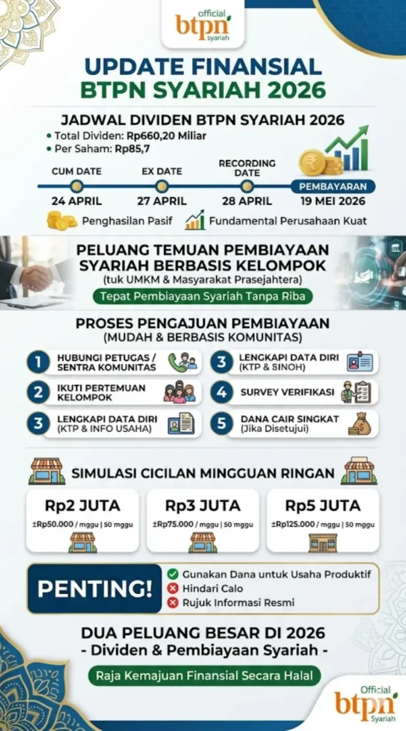 Jadwal Dividen BTPN Syariah 2026 resmi diumumkan! Total dividen Rp660,20 miliar atau Rp85,7 per saham dengan cum date 24 April 2026 dan pembayaran 19 Mei 2026. Artikel ini membahas lengkap jadwal dividen BTPS 2026, cara apply pembiayaan syariah tanpa riba, serta simulasi cicilan mingguan yang ringan untuk UMKM.